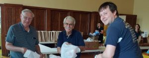 Volunteer: St. Michael’s provides the volunteers to prepare and serve food on the 4th Saturday of each month. There are two shifts–6:30-9:00 for food prep (age 18 and up) and 8:30-11:00 to serve food and clean up–with veteran servers always around to provide orientation. From 8:30-9:00, volunteers bag groceries provided by KC Nourish for those who attend the breakfast.